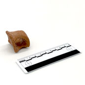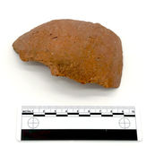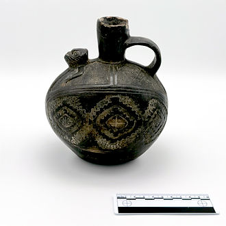 Polychromed container with a wide neck and a circular base with painted facial features of a character in hues of red, cream and black. Two triangular stripes radiate down from wide almond shaped eyes toward a downturned mouth highlighting teeth with linear incisions. The face painted in red is completed by a pair of cream tab-form ears on each side of its head. A painted red and cream geometric band rims the top.